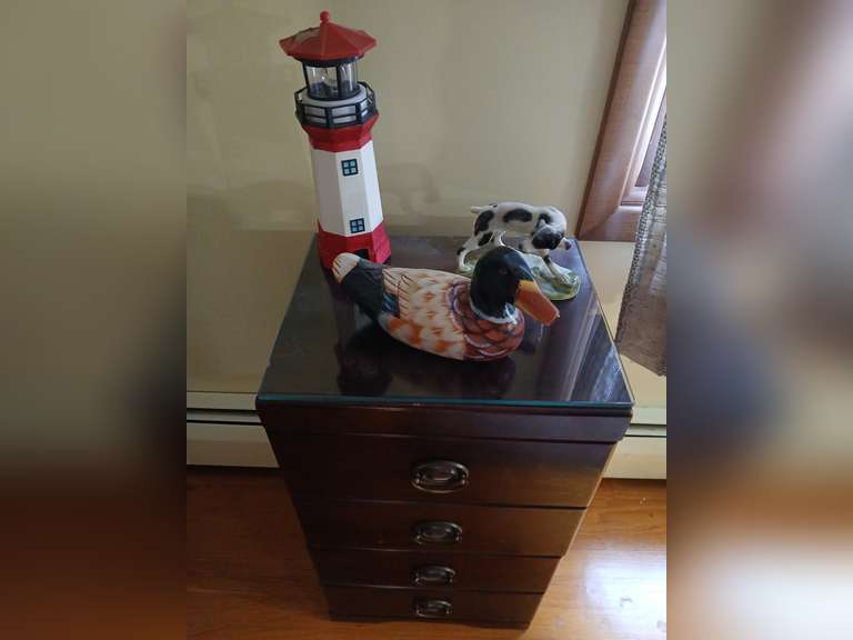 LOT 99 - Cherry style night stand 13"w x 26"h with decoy duck, porcelain dog and lighthouse