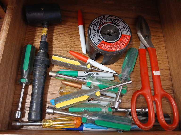 LOT 15 - Assortment Nut drivers, mallet, scissor snips, one tooth hole cutter and sharpies