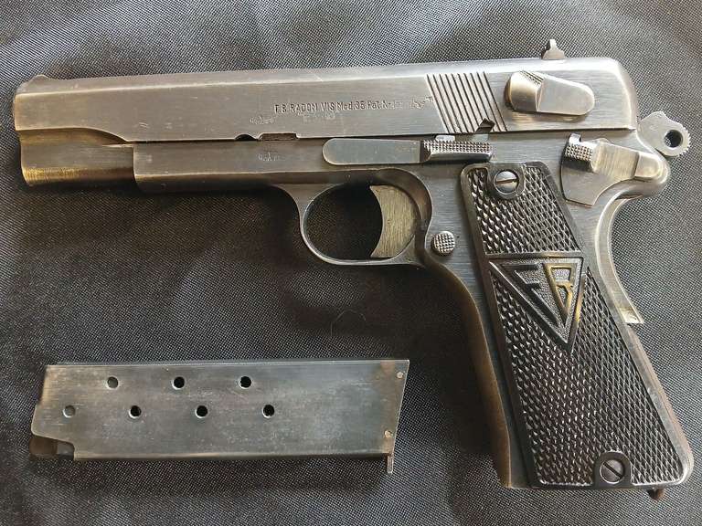 Lot 5:Rare F.B. Radom Vis P.35 9mm luger Mod.35, Pat No.15567. Customer Story: Was acquired from German officer at "Battle of the Bulge". This was considered a high quality pistol, especially for its time. After the Axis invaded Poland, the factory continued to produce firearms. The workers often stole parts and assembled pistols for the underground. They also made there way to the resistance by battlefield pickup from casualties and POWs. This one appears to have been produced in late 1942. Preview and Pickup at Expert Outfitters 9074 Market Street, North Lima, (Youngstown) Ohio 44452. Winning bidder to pay transfer fee at time of pickup.